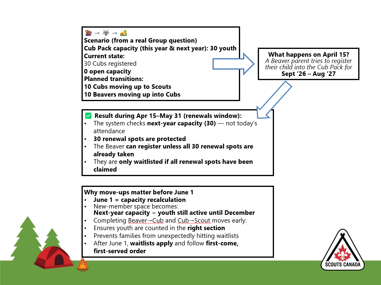 | Early Registration (renewals) | Apr 15–May 31 | Next-year capacity for the year being registered for (SY2027) | All renewal spots for that section are already claimed | Give returning members first opportunity to secure next year seats |