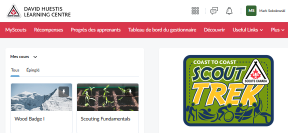 Sur la page d'accueil du Centre d'apprentissage David Huestis, cliquez sur Badge de bois I dans le widget Mes cours.