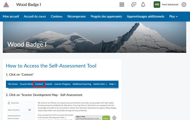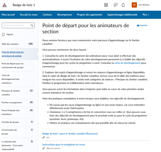 Note : Le Badge de Bois I pour le Sentier Canadien est accessible en utilisant ces instructions pour les animateurs de section. Le système d'apprentissage en ligne reconnaît le rôle dans lequel vous êtes inscrit et inclut le Badge de bois applicable à votre rôle, auquel vous pouvez accéder à partir de votre page d'accueil.